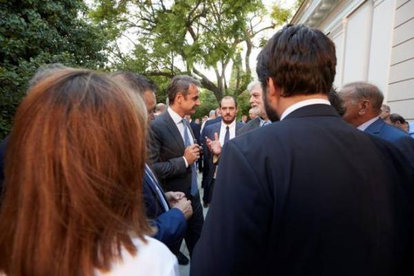 Με χαμόγελα και ευθυμία άντρες και γυναίκες που εξελέγησαν για πρώτη φορά βουλευτές με την ΝΔ συνομίλησαν με τον πρωθυπουργό κρατώντας ένα ποτό στο χέρι.