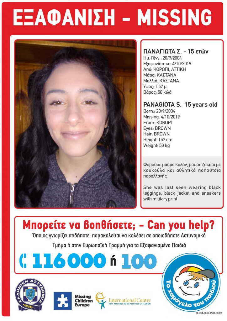 «Στις 04/10/2019 και ώρα 16:00, εξαφανίστηκε από την περιοχή του Κορωπίου, η Παναγιώτα Σ., 14 ετών» αναφέρει το Χαμόγελο του Παιδιού.