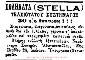 Ξέρατε ότι το 1899 στο Κέντρο της Αθήνας, απέναντι από την Κλαυθμώνος (εκεί όπου σήμερα είναι ο ΙΑΝΟΣ) υπήρχε ποδηλατάδικο; Ναι. Από την εφημερίδα «Εμπρός» (2/11/1899) διαβάζουμε για τα ποδήλατα «Stella» που πωλούνται με έκπτωση στο κατάστημα της Σταδίου 24.