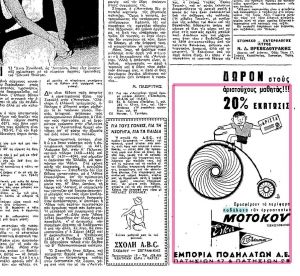 Δίτροχα και τρίτροχα παιδικά ποδήλατα πωλούνταν από 80 έως 1900 δρχ. όπως μας ενημερώνει η διαφήμιση σε σχετικό δημοσίευμα της εφημερίδας «Ελευθερία».