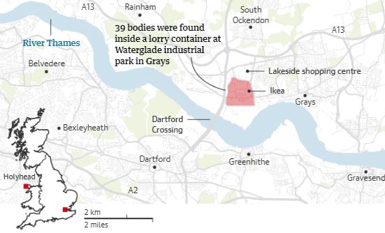 Ειδικότερα, το φορτηγό είχε ξεκινήσει από την πόλη Zeebrugge του Βελγίου και είχε φτάσει στο Purfleet της Αγγλίας με πλοίο. Η αστυνομία πλέον προσπαθεί να εξακριβώσει πότε οι 39 άνθρωποι μπήκαν στο κοντέινερ – ψυγείο.