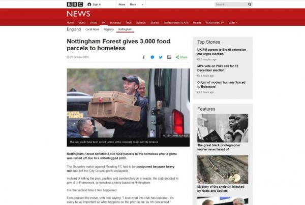 Μια κίνηση, που έκανε το CNN να συνδέσει τη Νότιγχαμ Φόρεστ με τον θρυλικό ήρωα της περιοχής, Ρομπέν των Δασών, ο οποίος στον Μεσαίωνα βοηθούσε όσους είχαν ανάγκη. Μια σπουδαία πρωτοβουλία, που πήρε μεγάλη προβολή από τα βρετανικά Μέσα, τα οποία δημοσίευσαν φωτογραφίες από τη διανομή των τροφίμων στους άστεγους της περιοχής.