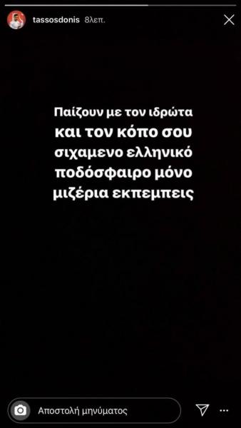 Καυστική ανάρτηση στα social media για τα όσα συνέβησαν στην Τούμπα έκανε ο γιος του προπονητή του Παναθηναϊκού, Γιώργου, και αδερφός του παίκτη του Τριφυλλιού, Χρήστου, Τάσος Δώνης.