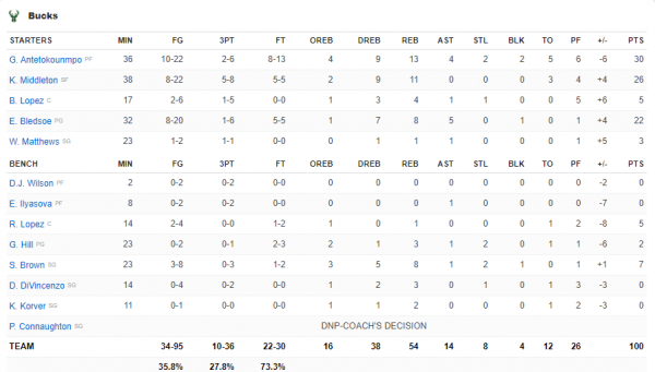 Για τους Μπακς ο Αντετοκούνμπο είχε 30 πόντους και 13 ριμπάουντ ενώ ο Μίντλετον ακολούθησε με 26 πόντους και 11 ριμπάουντ και ο Μπλέντσο 22 πόντους.
