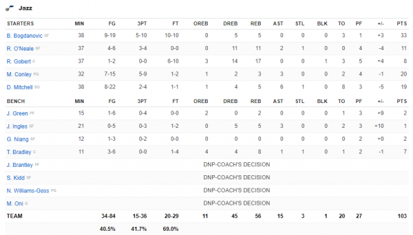 O Kροάτης ήταν και ο πρώτος σκόρερ του ματς με 33 πόντους ενώ 20 είχε Κόνλαι και 19 ο Μίτσελ για τους Τζαζ.