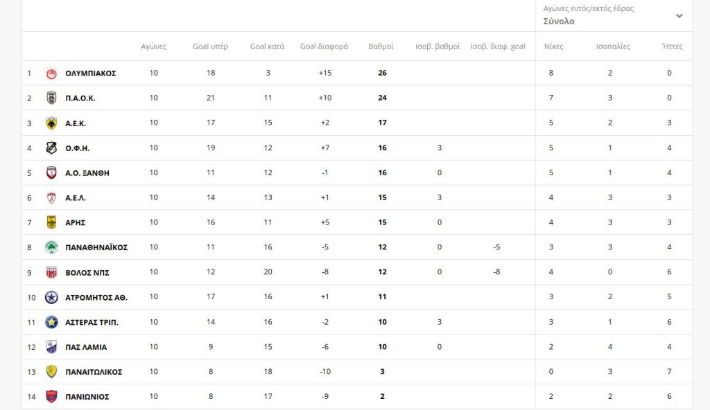 Από εκεί και πέρα, στην κορυφή βρίσκεται ο Ολυμπιακός με 26 πόντους, ενώ ακολουθεί ο ΠΑΟΚ με 24 βαθμούς.