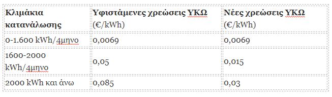 Στον κάτωθι πίνακα περιγράφονται οι υφιστάμενες χρεώσεις ΥΚΩ στα νυχτερινά τιμολόγια και οι νέες που θα ισχύουν μετά την ψήφιση του νομοσχεδίου.
