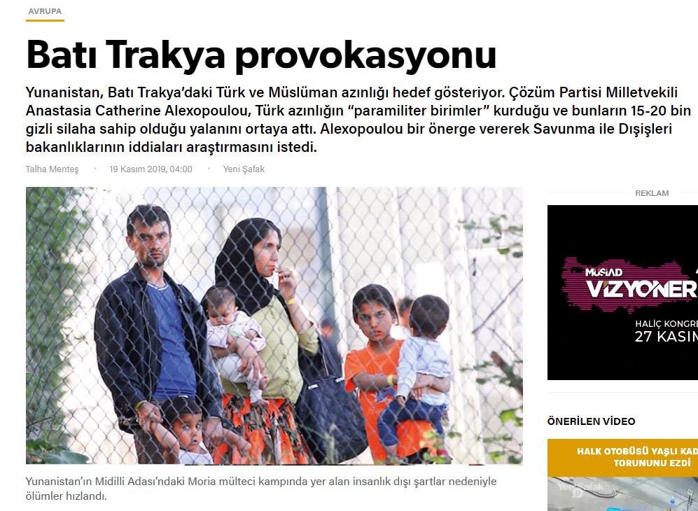 Το εν λόγω δημοσίευμα επικαλείται την ερώτηση που απηύθυνε η βουλευτής της Ελληνικής Λύσης, Αναστασία Αικατερίνη Αλεξοπούλου προς τους υπουργούς Εθνικής Άμυνας, Νίκο Παναγιωτόπουλο, και Εξωτερικών, Νίκο Δένδια, σχετικά με τη Δυτική Θράκη και πώς «εξοπλίζεται» η μουσουλμανική μειονότητα.