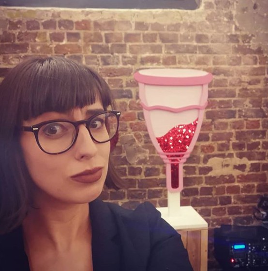 Σε έναν εσωτερικό χώρο στην αγορά Stables του Camden, ένα υπερμεγεθές ταμπόν πλαισιώνεται από γιγαντιαία κύπελλα εμμηνόρροιας.
