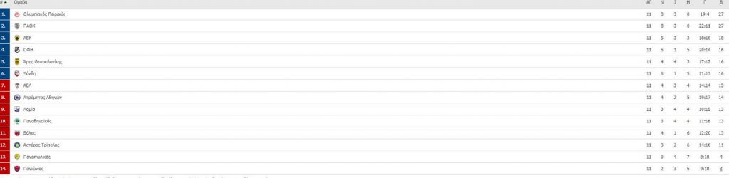 Η βαθμολογία μετά από 11 αγωνιστικές: