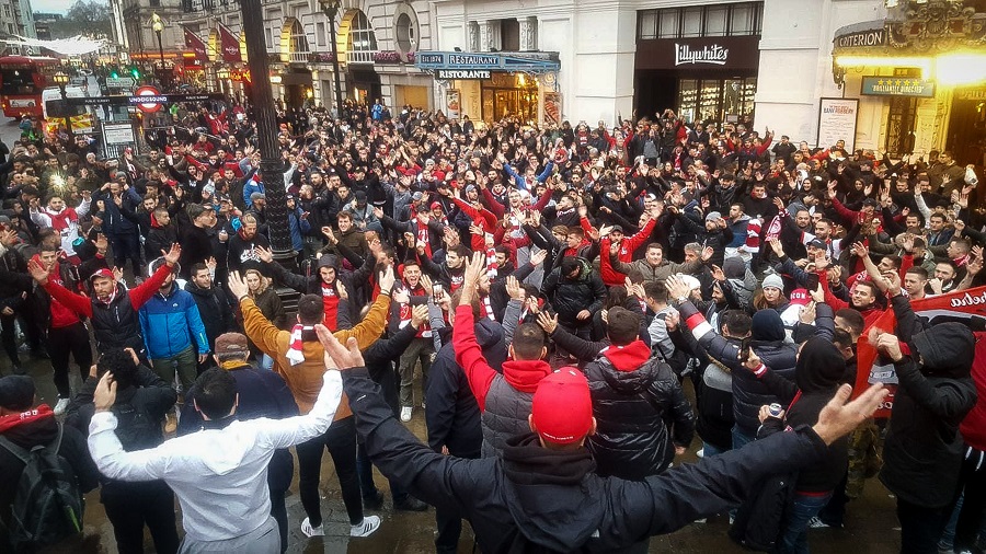 Μαζεύτηκαν από νωρίς στη «Piccadilly Circus» και έδωσαν «ερυθρόλευκο» χρώμα σε μία από τις μεγαλύτερες πλατείες της βρετανικής πόλης.