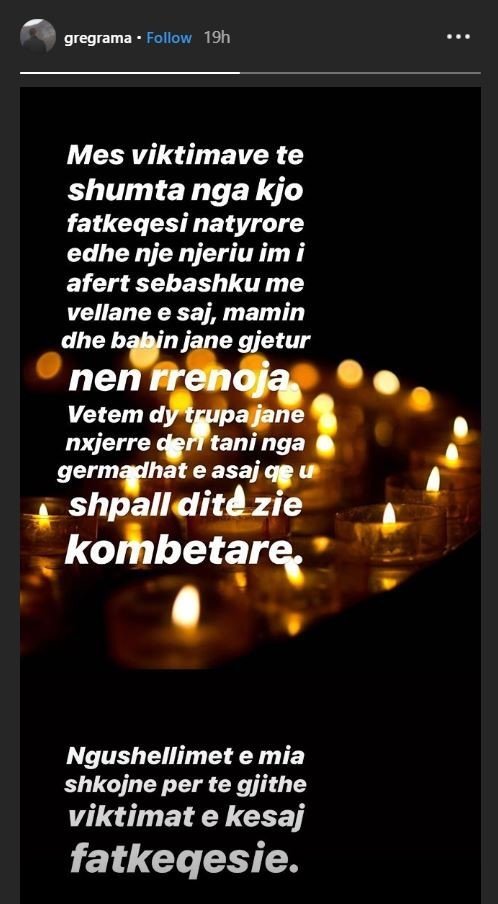 Η νεαρή κοπέλα βρήκε τραγικό θάνατο, σύμφωνα με το ιταλικό πρακτορείο ειδήσεων Ansa, σε μια εξαώροφη πολυκατοικία που κατέρρευσε στο Δυρράχιο. Ο Γκρέγκορ Ράμα, γιος του Εντι Ράμα είχε εδώ και μερικά χρόνια σχέση με την 24χρονη Κρίστι Ρέτσι. Σύμφωνα με το προφίλ της στο Facebook, είχε αποφοιτήσει από το πανεπιστήμιο των Τιράνων, με πτυχίο Δερματολογίας.