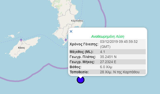 Σεισμός 4,1 Ρίχτερ σημειώθηκε πριν από λίγο στη θαλάσσια περιοχή ανοιχτά της Καρπάθου.