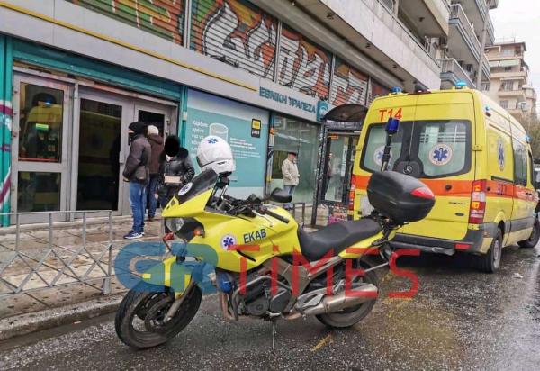 Παρά τον βροχερό και παγωμένο καιρό, μέσα σε ελάχιστο χρόνο έφτασε στην τράπεζα δικυκλιστής διασώστης του ΕΚΑΒ και δύο ασθενοφόρα.