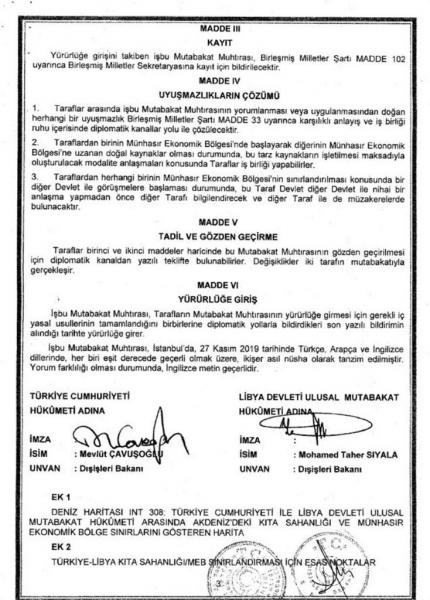 Στο τέλος του κειμένου του μνημονίου παρατίθενται αναλυτικά οι συντεταγμένες που περιλαμβάνει η συμφωνία. Στην αρχή οι συντεταγμένες στην περιοχή της Τουρκίας και έπειτα οι συντεταγμένες στην περιοχή της Λιβύης.