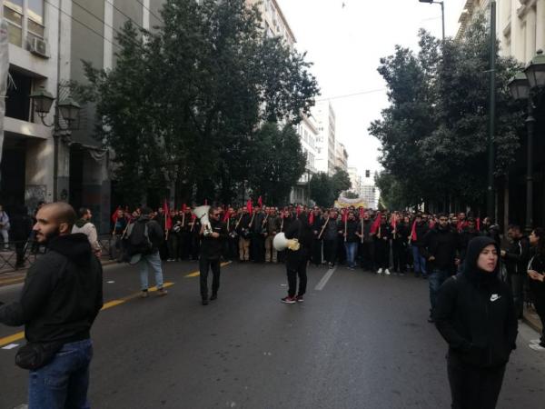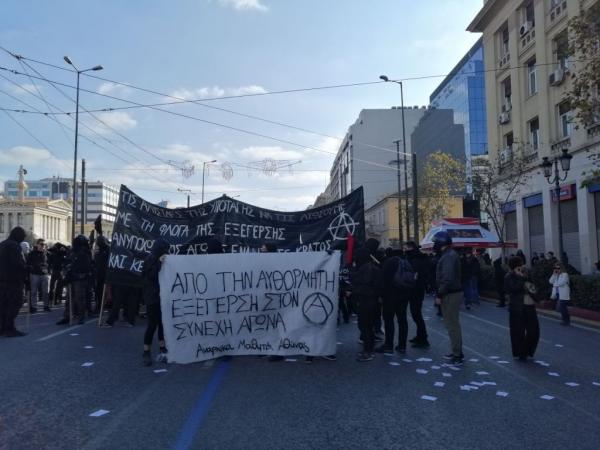 Η πορεία πέρασε από την πλατεία Κλαυθμώνος με το πλήθος να φωνάζει συνθήματα στη μνήμη του Αλέξανδρου Γρηγορόπουλου, όπως «Αυτές οι μέρες είναι του Αλέξη» και τις διμοιρίες των ΜΑΤ να τους ακολουθούν και από τις δύο πλευρές.