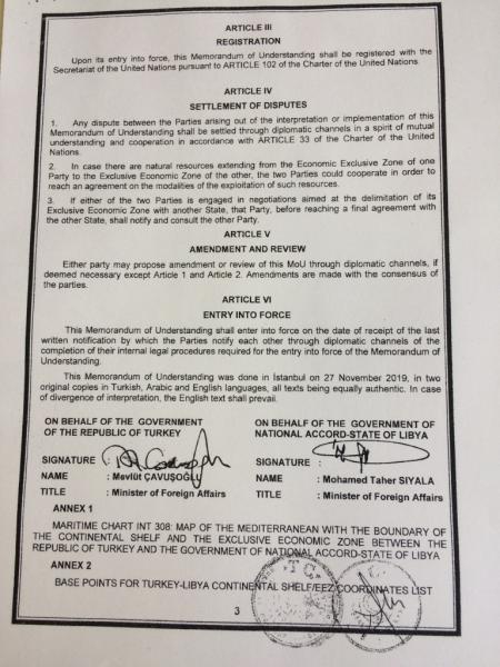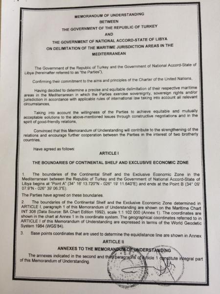 «Η Τουρκία και η Λιβύη, επιβεβαιώνοντας τη δέσμευσή τους στους σκοπούς και τις αρχές του Χάρτη των Ηνωμένων Εθνών, έχοντας αποφασίσει να ορίσουν μια ακριβή και δίκαιη οριοθέτηση των θαλασσίων ζωνών τους στη Μεσόγειο στις οποίες οι δύο πλευρές ασκούν κυριαρχία, κυριαρχικά δικαιώματα και/ή δικαιοδοσία σε συμφωνία με τους ισχύοντες κανόνες διεθνούς δικαίου και λαμβάνοντας υπόψη όλες τις σχετικές καταστάσεις αλλά και την προθυμία όλων των μερών να επιτύχουν δίκαιες και αμοιβαία αποδεκτές λύσεις στα παραπάνω θέματα μέσω εποικοδομητικών διαπραγματεύσεων και σε πνεύμα φιλικών σχέσεων, ούσες πεπεισμένες ότι αυτό το μνημόνιο κατανόησης θα συνεισφέρει στην ενδυνάμωση των σχέσεων και θα ενθαρρύνει περαιτέρω τη συνεργασία μεταξύ των μερών προς το συμφέρον των δύο αδελφών-κρατών, συμφώνησαν τα ακόλουθα: