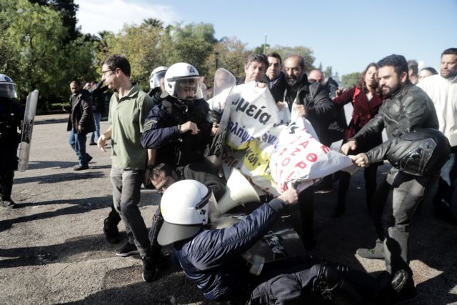 Σύμφωνα με τις πρώτες πληροφορίες, οι συνδικαλιστές μπήκαν στην αίθουσα κρατώντας ντουντούκες και φωνάζοντας συνθήματα παρότι έξω από την αίθουσα υπήρχε ισχυρή δύναμη της αστυνομίας.