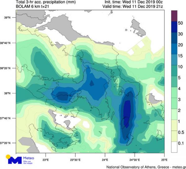 Παράλληλα, από το απόγευμα νέο κύμα τοπικά ισχυρών βροχών και καταιγίδων θα επηρεάσουν τα νότια τμήματα της χώρας, συμπεριλαμβανομένων του νομού Αττικής και της πόλης της Αθήνας, όπως φαίνεται στον ακόλουθο προγνωστικό χάρτη, για το βράδυ της Τετάρτης.
