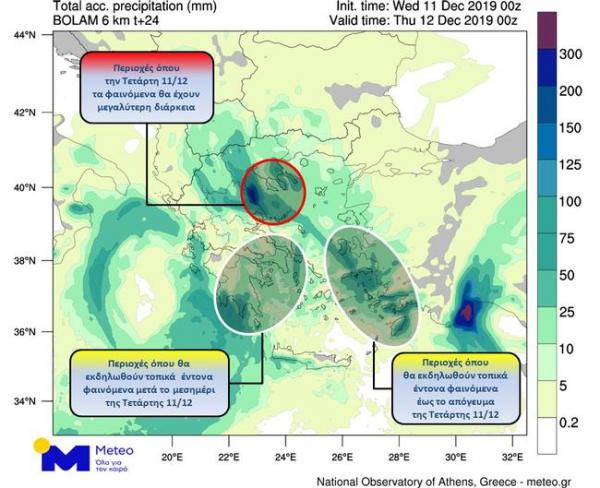 Στον προγνωστικό χάρτη που ακολουθεί παρουσιάζονται οι αθροιστικές ποσότητες υετού (βροχές / καταιγίδες / χιονοπτώσεις) της «Διδούς», έως τις βραδινές ώρες της Τετάρτης 11/12.