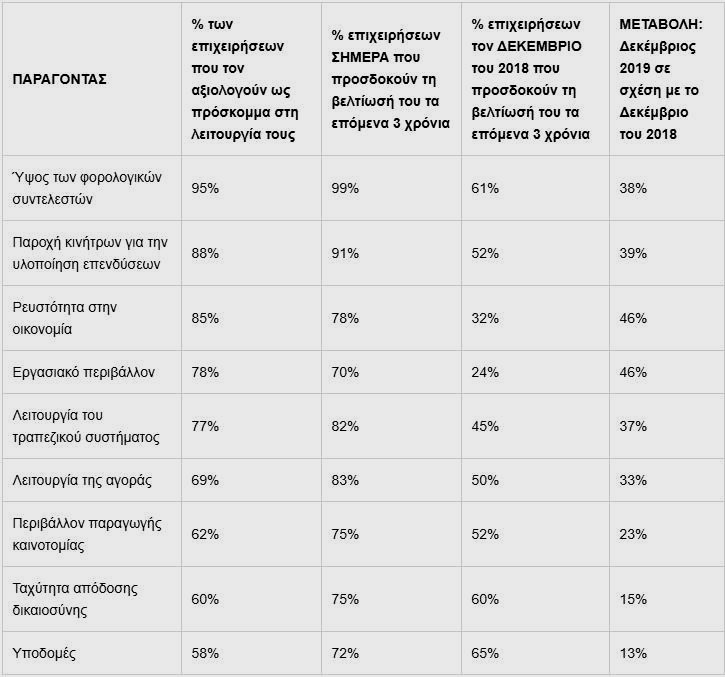 Σε όλες τις απαντήσεις, πάντως, το ποσοστό των επιχειρήσεων, που προσδοκούν βελτίωση κατάστασης στα επόμενα τρία χρόνια, είναι σημαντικά μεγαλύτερο (από 13% εως 46%), σε σχέση με το αντίστοιχο του Δεκεμβρίου του 2018.