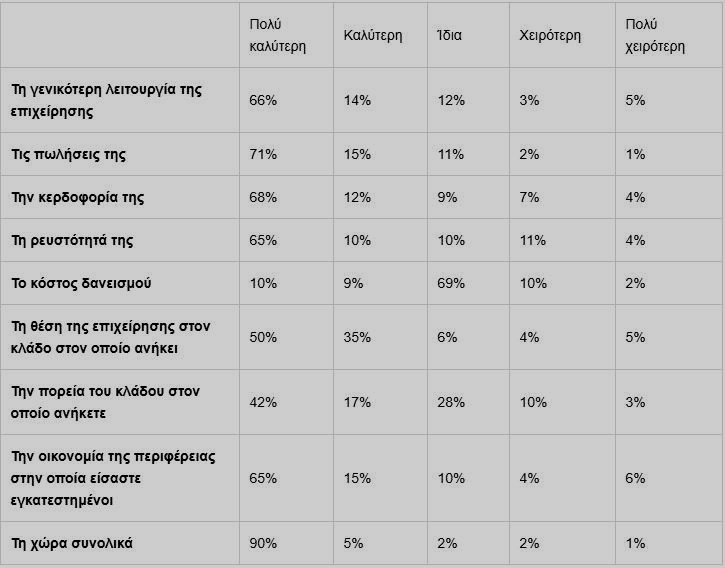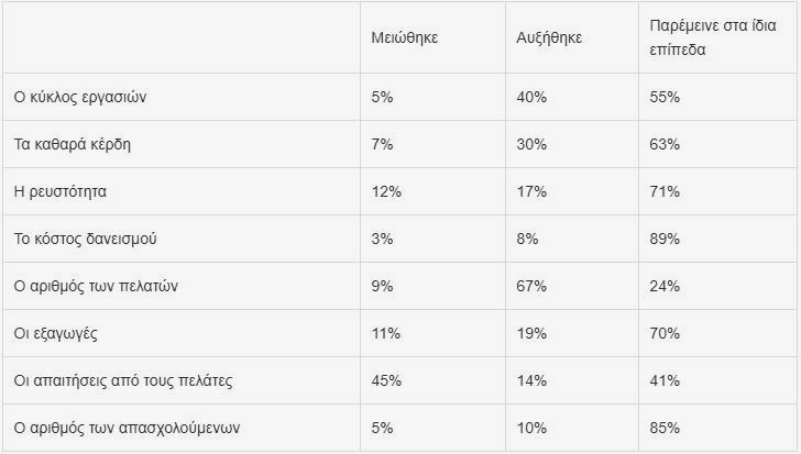 Σε σχέση με τα καθαρά κέρδη τους, το 63% απάντησε ότι έμειναν στα ίδια επίπεδα, το 30% ότι αυξήθηκαν και το 7% ότι μειώθηκαν, ενώ τα αντίστοιχα ποσοστά για τη ρευστότητα ήταν 71%, 17% και 12% και για το κόστος δανεισμού 89%, 8% και 3%.