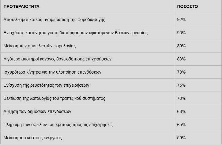 ενισχύσεις και κίνητρα για τη διατήρηση των υφιστάμενων θέσεων εργασίας (90%), μείωση των συντελεστων φορολογίας (89%), λιγότερο αυστηροί κανόνες δανειοδότησης επιχειρήσεων (83%), ισχυρότερα κίνητρα για την υλοποίηση επενδύσεων (78%), ενίσχυση ρευστότητας (75%), βελτίωση της λειτουργίας του τραπεζικού συστήματος (70%), αύξηση των δημόσιων επενδύσεων (68%), πληρωμή των οφειλών του κράτους προς τις επιχειρήσεις (65%) και μείωση του κόστους της ενέργειας (59%).