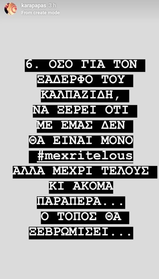 «Οσο για τον ξάδερφο του Καλπαζίδη, να ξέρει ότι με εμάς δεν είναι μόνο #mexritelous, αλλά μέχρι τέλους και ακόμη παραπέρα… Ο τόπος θα ξεβρωμίσει…» το μήνυμα του Κώστα Καραπαπά.