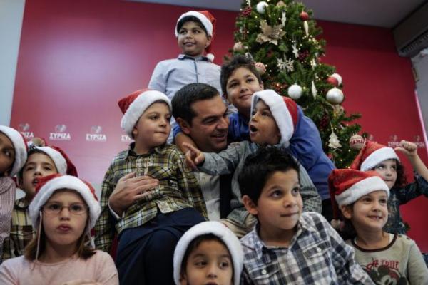Ο Αλέξης Τσίπρας μαζί με τη σύντροφό του Μπέτυ Μπαζιάνα, αφού τραγούδησαν μαζί με τα παιδιά τα κάλαντα, τους έδωσαν δώρα.