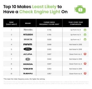 Στην πρώτη θέση βρέθηκε η Mercedes-Benz , με την έρευνα της CarMD να αναφέρει ότι είναι η  πιο αξιόπιστη αυτοκινητοβιομηχανία με τα λιγότερα προβλήματα, και χωρίς να ανάψει η προειδοποιητική λυχνία ελέγχου του κινητήρα. Στην δεύτερη θέση βρέθηκε η Mitsubishi, στην τρίτη η Buick – αμερικάνικη φίρμα , με τις Ram ( επίσης αμερικάνικη) και Ford να συμπληρώνουν την πρώτη πεντάδα.