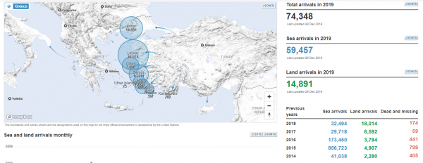 Σύμφωνα με τα στοιχεία της Ύπατης Αρμοστείας των Ηνωμένων Εθνών, 74.348 πρόσφυγες πέρασαν τα σύνορα της Ελλάδας το 2019, αριθμός ο οποίος είναι διπλάσιος σε σχέση με πέρυσι (32,494).