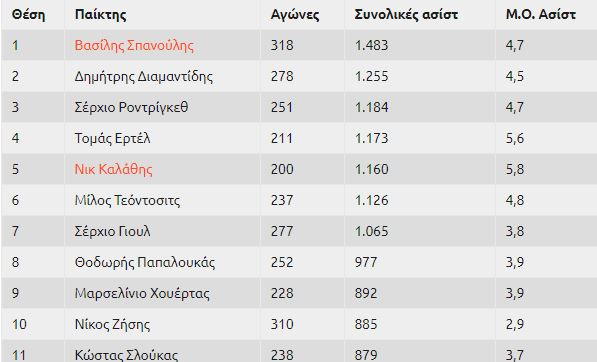 Κορυφαίος φυσικά σε αυτή τη λίστα είναι ο Βασίλης Σπανούλης με 1.483 ασίστ σε 318 παιχνίδια και 2ος έρχεται ο Δημήτρης Διαμαντίδης με 1.255 ασίστ σε 278 παιχνίδια. Στη δεκάδα είναι και ο Νικ Καλάθης, όντας στην 5η θέση με 1.160 ασίστ. Αξίζει να σημειωθεί πάντως, πως ο γκαρντ του Παναθηναϊκού έχει τα λιγότερα παιχνίδια από όλους τους άλλους παίκτες της πρώτης δεκάδας.