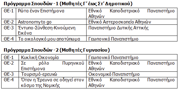 Κάθε Πρόγραμμα Σπουδών είναι οργανωμένο σε Θεματικές Ενότητες διαφορετικών γνωστικών αντικειμένων και περιλαμβάνει εργαστήρια και διαλέξεις που θα παραδίδονται τα Σάββατα, από επιστημονικό προσωπικό και στους χώρους Ιδρυμάτων της Περιφέρειας: