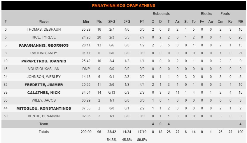 Ο Παναθηναϊκός είχε έναν εξαιρετικό Ταϊρίς Ράις, ο οποίος εκτέλεσε με ακρίβεια (20 πόντοι με εξαιρετική στατιστική), πήρε 2 ριμπάουντ, μοίρασε 6 ασίστ, έκανε 1 κλέψιμο για 2 λάθη. Υπέροχος. Κι επειδή το… δίδυμο του «κοντού και του ψηλού» ήταν Παναθηναϊκοί, ο Γιώργος Παπαγιάννης έδωσε ισορροπία με 13 πόντους και μόλις μια χαμένη βολή, αλλά και 5 ριμπάουντ. Βάλτε και τον Καλάθη με τους 14 πόντους και τις 11 ασίστ, τους Τζόνσον και Παπαπέτρου, αλλά και τον Τόμας στην επίθεση (στην άμυνα, ας μην το συζητήσουμε) κι έχετε την εικόνα.