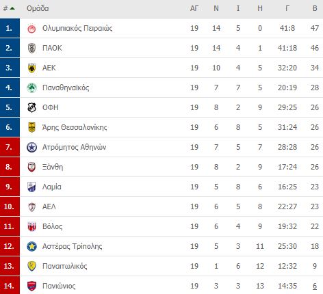 Η βαθμολογία μετά από 19 αγωνιστικές:
