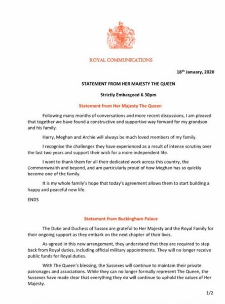Στην ανακοίνωση του το Μπάκιγχαμ αναφέρει ότι σύμφωνα με τη νέα συμφωνία ο πρίγκιπας Χάρι και η Μέγκαν Μαρκλ απαιτείται να παραιτηθούν από τα βασιλικά τους καθήκοντα και δεν θα λαμβάνουν πλέον χρήματα από τα δημόσια κονδύλια για βασιλικά καθήκοντα.