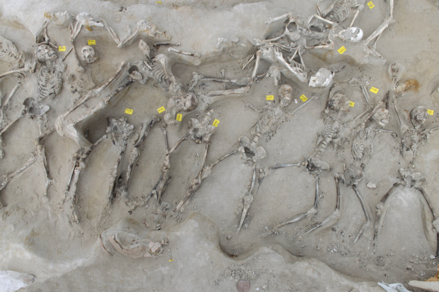 Πρόκειται για ομαδική ταφή 79 ανθρώπινων σκελετών χωρισμένων σε τρία ορύγματα και αλυσοδεμένων μεταξύ τους στους καρπούς.