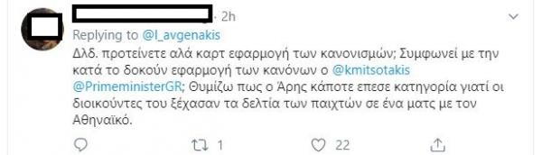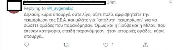Οι ποινές είναι ξεκάθαρες», ήταν μερικά από τα μηνύματα που δέχθηκε ο Υφυπουργός στον λογαριασμό του. Ο κόσμος έβγαλε στη… σέντρα τον Υφυπουργό και ζητάει να εφαρμοστούν οι νόμοι και ποινές, που προβλέπουν τον υποβιβασμό των δύο ομάδων.