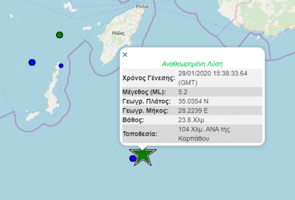 Η δόνηση είχε εστιακό βάθος 23,8 Χλμ και επίκεντρο 104 Χλμ ανατολικά της Καρπάθου.