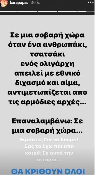 Αναλυτικά όσα αναφέρει ο Καραπαπάς: «Σε μία σοβαρή χώρα όταν ένα ανθρωπάκι, τσατσάκι ενός ολιγάρχη απειλεί με εθνικό διχασμό και αίμα, αντιμετωπίζεται από τις αρμόδιες αρχές…