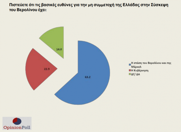 Για την Σύσκεψη στο Βερολίνο μόλις το 22,9% θεωρεί ότι φταίει η κυβέρνηση για την απουσία της χώρας, ενώ το 63,2% επικρίνει την καγκελάριο Μέρκελ.