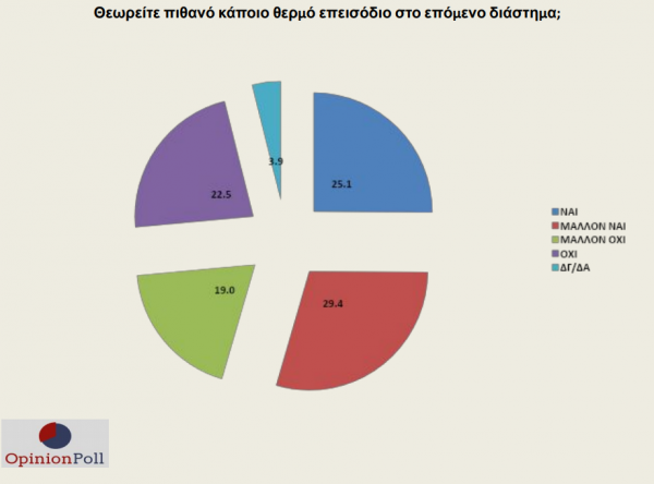 Οι πολίτες εμφανίζονται στην πλειοψηφία τους ανήσυχοι για το ενδεχόμενο ενός θερμού επεισοδίου – το 54,5% το θεωρεί ως πιθανό, ενώ αντίθετη άποψη έχει το 41,5%.