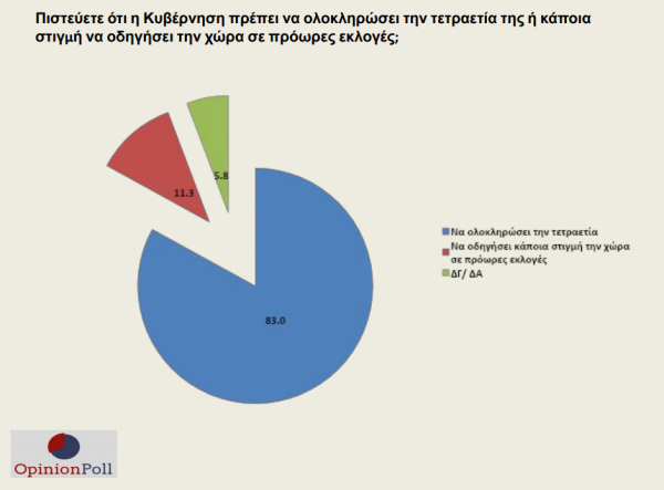 Με αφορμή την ψήφιση του νέου εκλογικού νόμου και τα σενάρια περί πρόωρων εκλογών, ένα συντριπτικό ποσοστό της τάξης του 83% ζητά να εξαντληθεί η τετραετία.