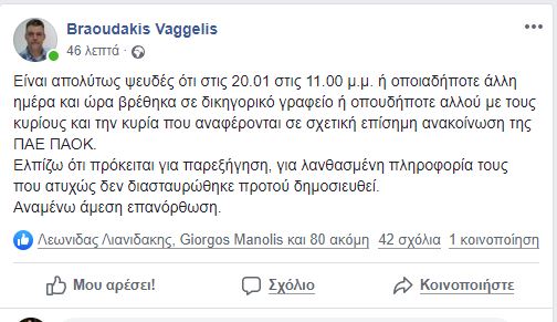 Απάντηση – διάψευση στα όσα υποστηρίζει ο ΠΑΟΚ ότι βρέθηκε στα γραφεία του δικηγόρου, κ. Τζουγανάτου, έδωσε ο Βαγγέλης Μπραουδάκης, μέσω του επίσημου λογαριασμού του στο Facebook. Ο Υπεύθυνος Γραφείου Τύπου του Λευτέρη Αυγενάκη έκανε λόγο για απολύτως ψευδή πληροφορία και τόνισε ότι περιμένει άμεση επανόρθωση.