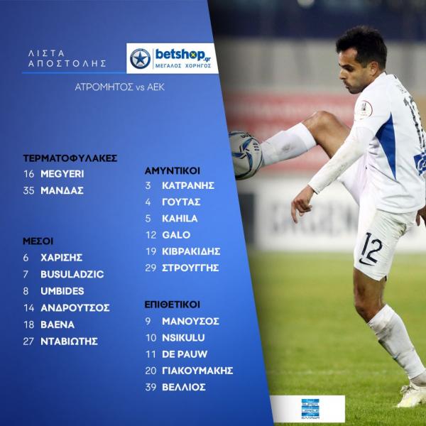 Ο Ατρόμητος ολοκλήρωσε την προετοιμασία του ενόψει ΑΕΚ και ο Σάββας Παντελίδης ανακοίνωσε την αποστολή στην οποία βρίσκεται ο Ντε Πο αλλά όχι ο Μάντσον.