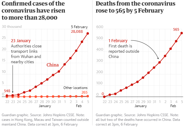 Η επιδημία της ιογενούς πνευμονίας έχει σκοτώσει περισσότερους από 560 ανθρώπους, ενώ τα κρούσματα μόνο στην Κίνα ξεπερνούν τα 28.000. Σχεδόν 3.700 νέα κρούσματα ανακοινώθηκαν μέσα σε μία μόνο ημέρα.