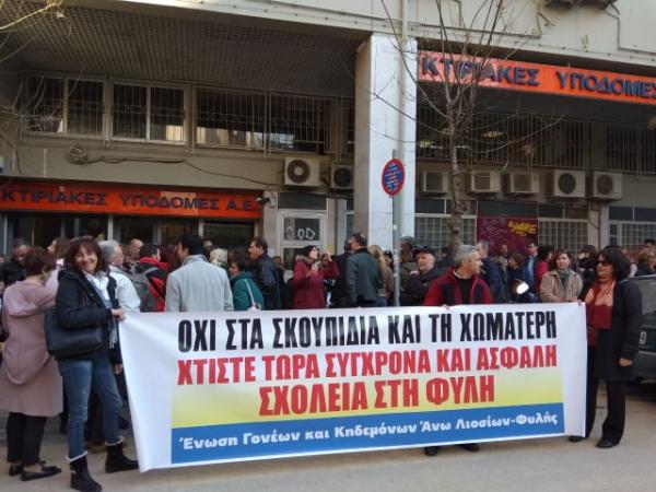Οι συγκεντρωμένοι διαμαρτυρήθηκαν για την κατάσταση των σχολικών κτιρίων και απαίτησαν επαρκή χρηματοδότηση για την συντήρηση των σχολείων και την αντισεισμική θωράκιση.