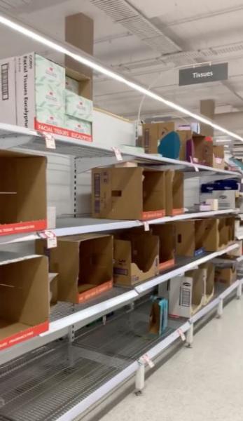 Στους ιστότοπος κοινωνικής δικτύωσης χρήστες αναρτούν φωτογραφίες που δείχνουν ράφια άδεια από χαρτί υγείας, κονσέρβες και άλλα προϊόντα όπως ρύζι και αβγά, ενώ έχουν γίνει viral τα hashtag #toiletpapercrisis (κρίση χαρτιού υγείας) #toiletpepaergate (χαρτί υγείας- γκέιτ).