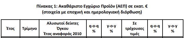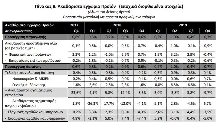 Ειδικότερα, με βάση τις ανακοινώσεις της ΕΛΣΤΑΤ, το Ακαθάριστο Εγχώριο Προϊόν (ΑΕΠ) σε όρους όγκου, κατά το 4ο τρίμηνο 2019, παρουσίασε μείωση κατά 0,7%, σε σχέση με το 3ο τρίμηνο 2019, ενώ σε σύγκριση με το 4ο τρίμηνο 2018 αύξηση μόλις 1%.
