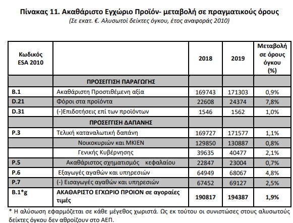 Με αυτά τα δεδομένα, το ΑΕΠ της χώρας ανήλθε πέρυσι σε 194,4 δισ. ευρώ έναντι 190,8 δισ. ευρώ το 2018, παρουσιάζοντας αύξηση κατά 1,19%..